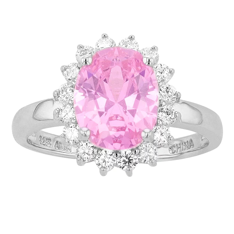 Make a bold statement with this exquisite Brilliante sterling silver ring, showcasing a mesmerizing 10x8mm oval pink simulated diamond surrounded by a radiant halo of sparkling accents. The thoughtfully designed setting maximizes light reflection, delivering impressive brilliance and fire that rivals traditional diamonds. Crafted from authentic sterling silver for lasting durability and timeless appeal, this ring offers luxury aesthetics at an accessible price point. Whether celebrating an engagement, milestone moment, or simply indulging in fine jewelry, this piece brings sophistication and confidence to your everyday style. A versatile treasure that complements any wardrobe.