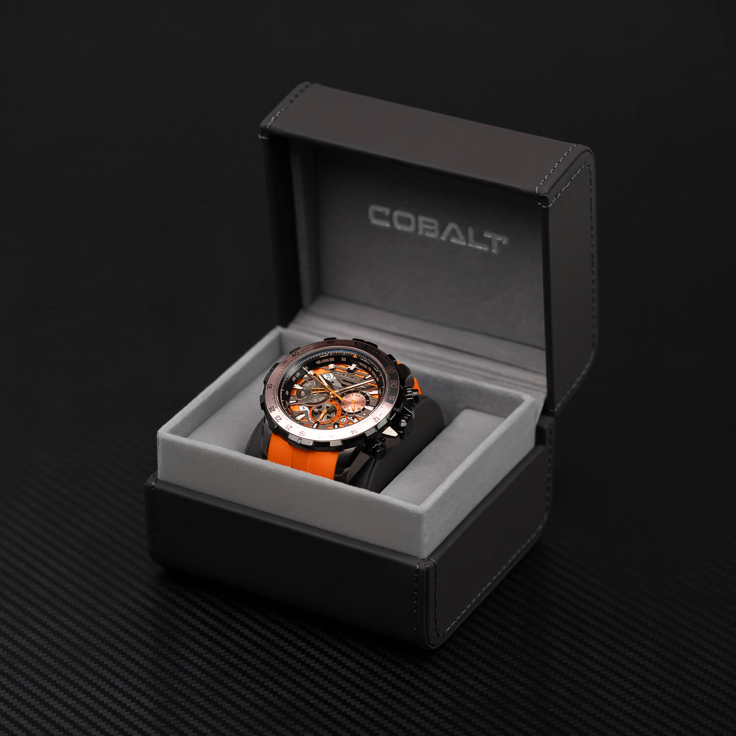 The Cobalt Airborne is an aviation-inspired chronograph wrist watch built for men who move with purpose. Powered by a precision quartz movement and secured with a rugged silicone band, it's made for action in the air and on the ground. A bold sapphire crystal protects the dial, and 10 ATM water resistance means it’s ready wherever you take flight. This is a new Cobalt watch designed for those who want more from their gear.