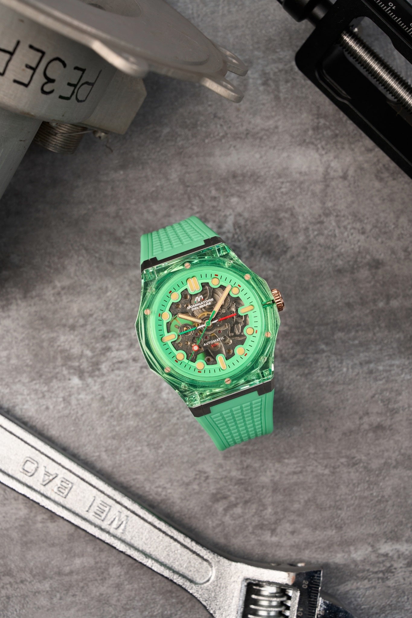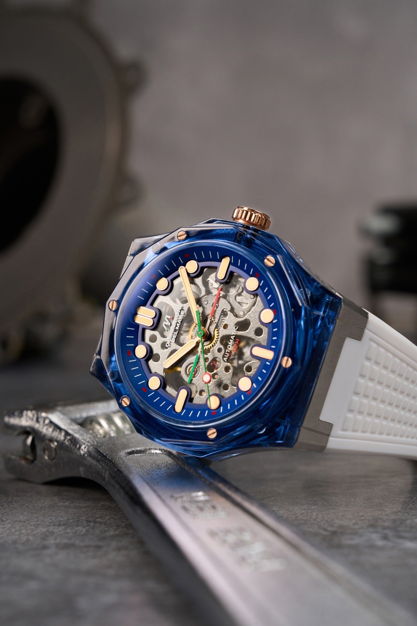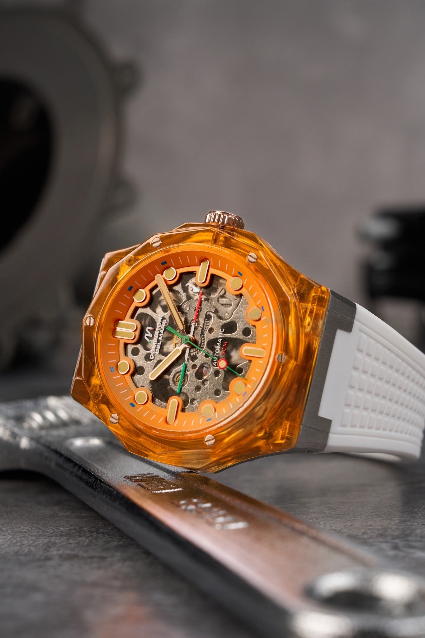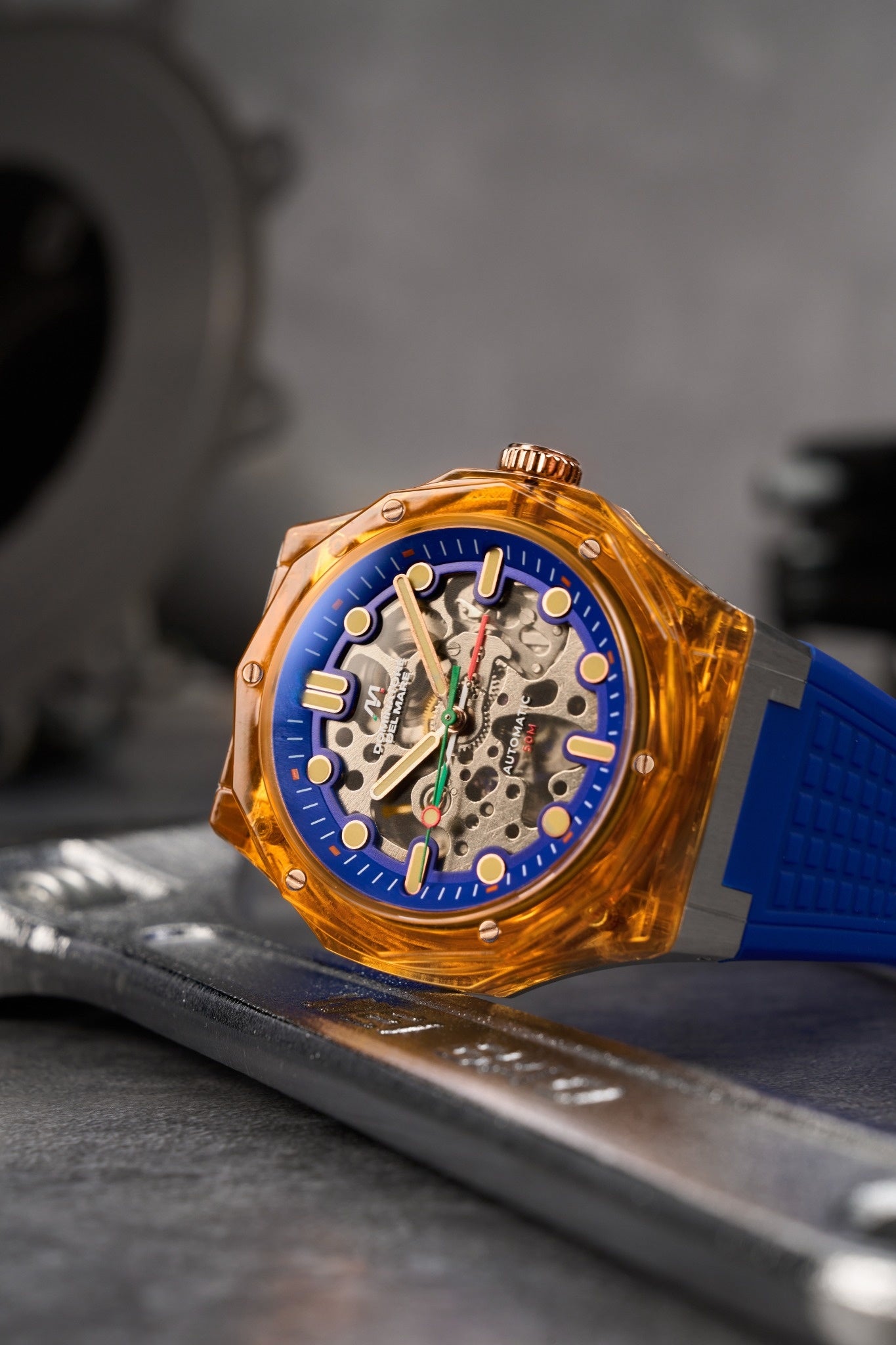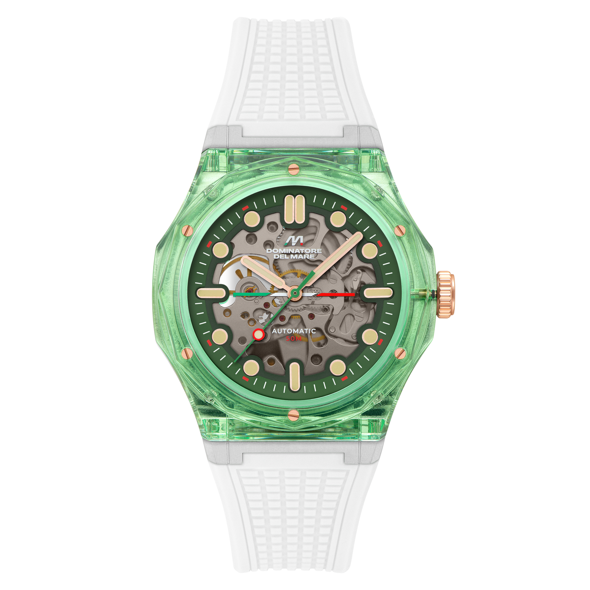 Ravello Automatic is a bold tribute to the natural beauty and vibrant spirit of Ravello, the jewel of the Amalfi Coast. Its intricate skeleton dial reveals the artistry of its automatic movement, while the semi-transparent case captures the glow of Amalfi sunsets and the vibrance of Ravello’s festivals. Like the coastal town, the Ravello Automatic marks a remarkable presence on your wrist.