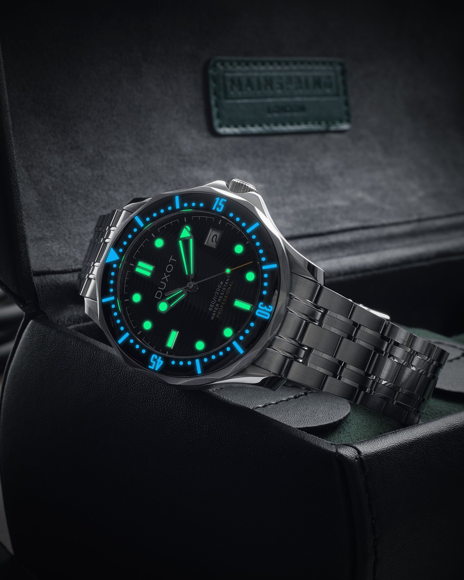 The Duxot Men's 41mm Henri Diver showcases precision engineering with customizable dial options to match your personal style. Powered by an automatic movement, this timepiece delivers dependable performance in a 41mm case proportioned for contemporary wrists. Built for diving enthusiasts, it features water resistance, a unidirectional rotating bezel, and scratch-resistant sapphire crystal. The integrated bracelet combines comfort with refined durability, while the dial color selection allows you to tailor the watch to your aesthetic preferences. A sophisticated instrument for those who demand both technical capability and distinctive design.