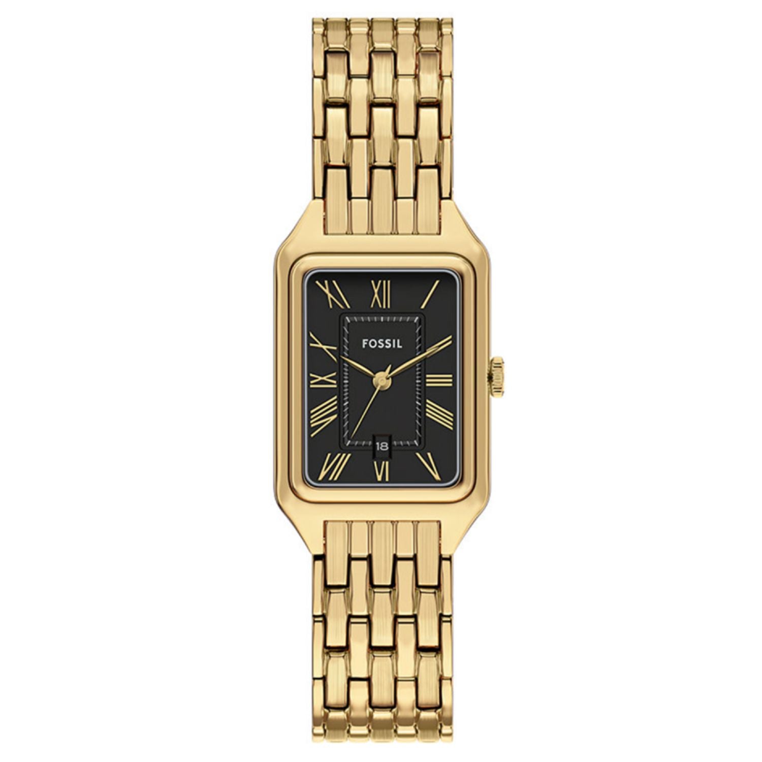 The Fossil Women's Raquel combines timeless elegance with everyday practicality. This 23mm quartz watch features a striking black dial that pairs beautifully with a gleaming goldtone bracelet, creating a sophisticated look suitable for any occasion. The date window keeps you organized at a glance, while the reliable quartz movement ensures accurate timekeeping. The polished goldtone bracelet offers a classic aesthetic that complements both casual and professional styles. Perfect for those seeking a versatile timepiece that balances style and function, the Raquel is an ideal addition to any watch collection.