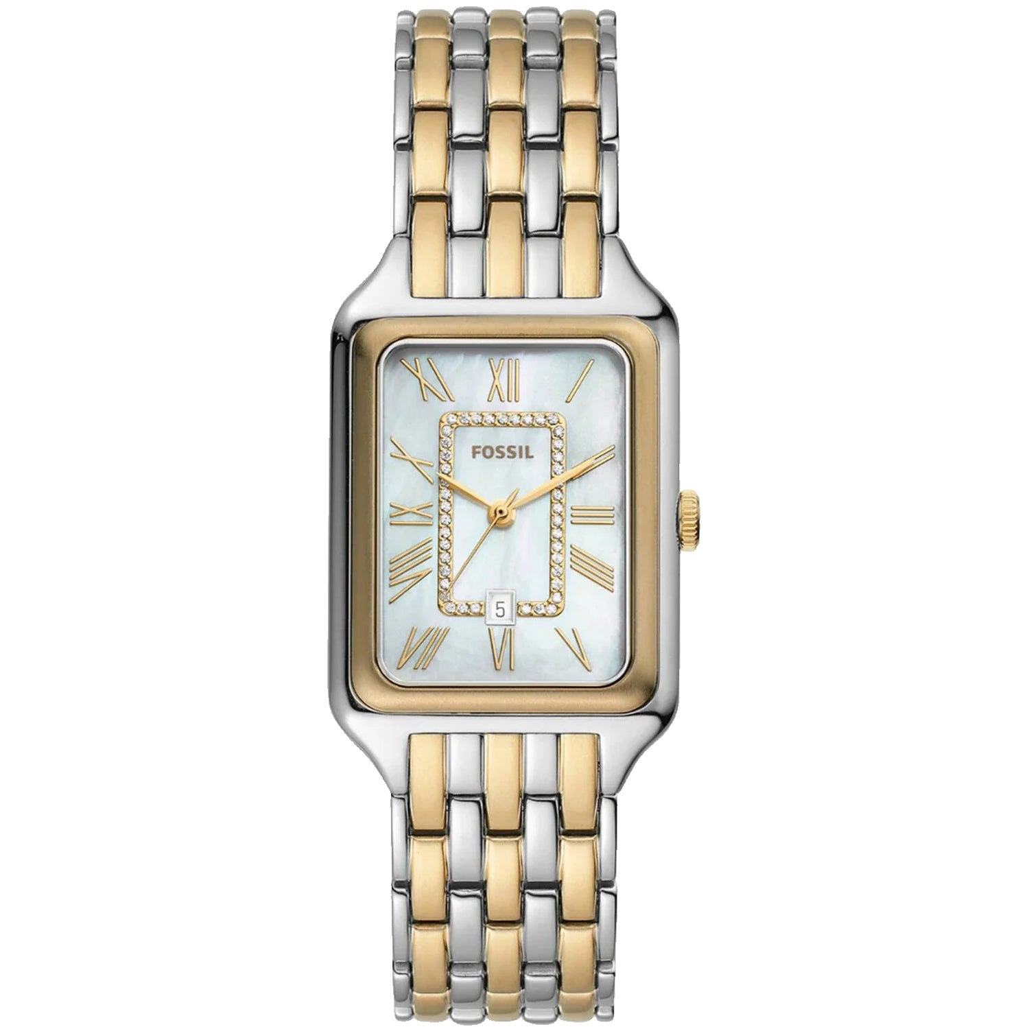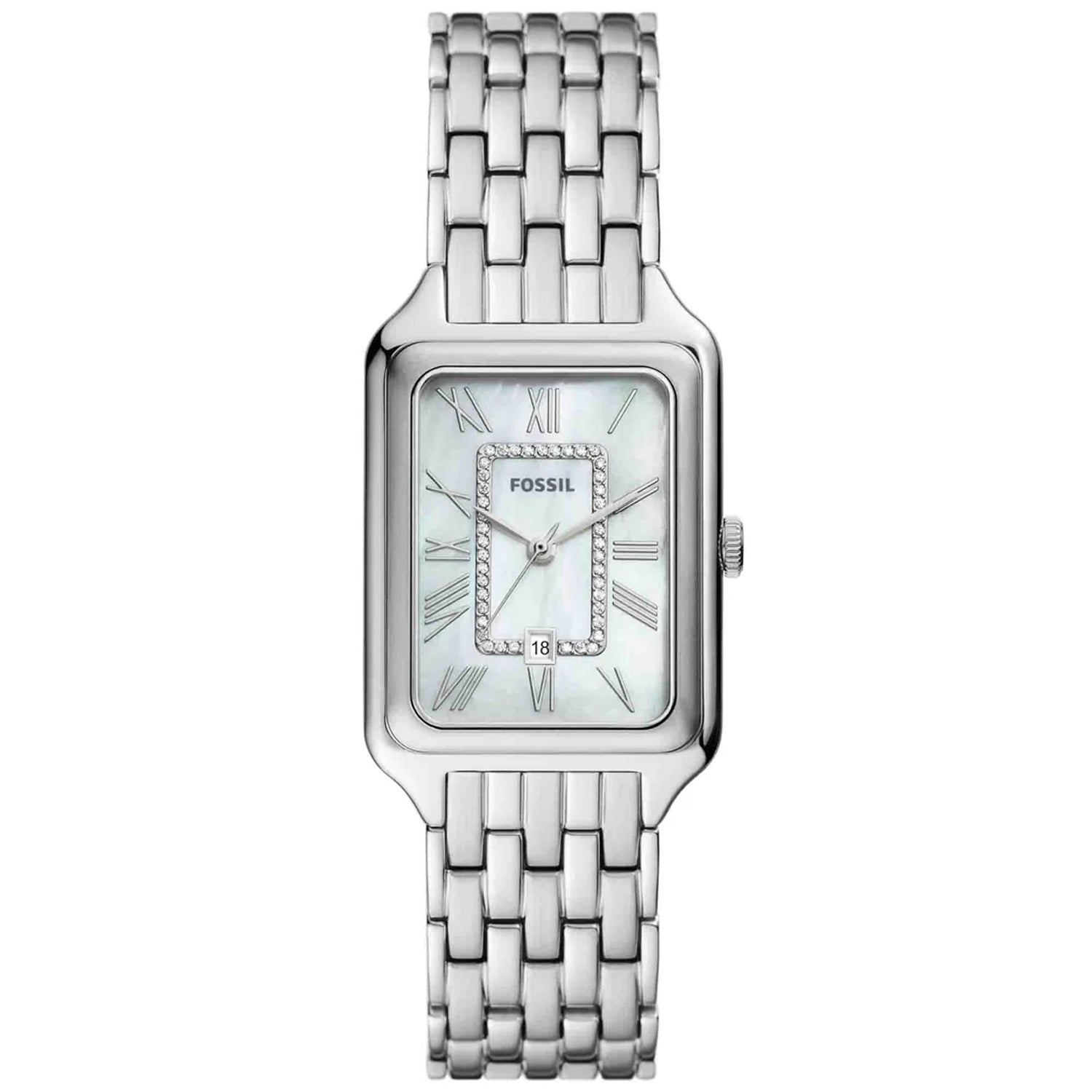 Elevate your everyday style with the Fossil Women's Raquel watch. This sophisticated timepiece features a sleek 26mm rectangular case adorned with sparkling crystal accents that catch the light beautifully. The quartz movement ensures reliable, accurate timekeeping, while the convenient date window keeps you organized. The polished bracelet band combines comfort with elegance, making it perfect for both professional settings and casual outings. A timeless accessory that seamlessly transitions from day to night.