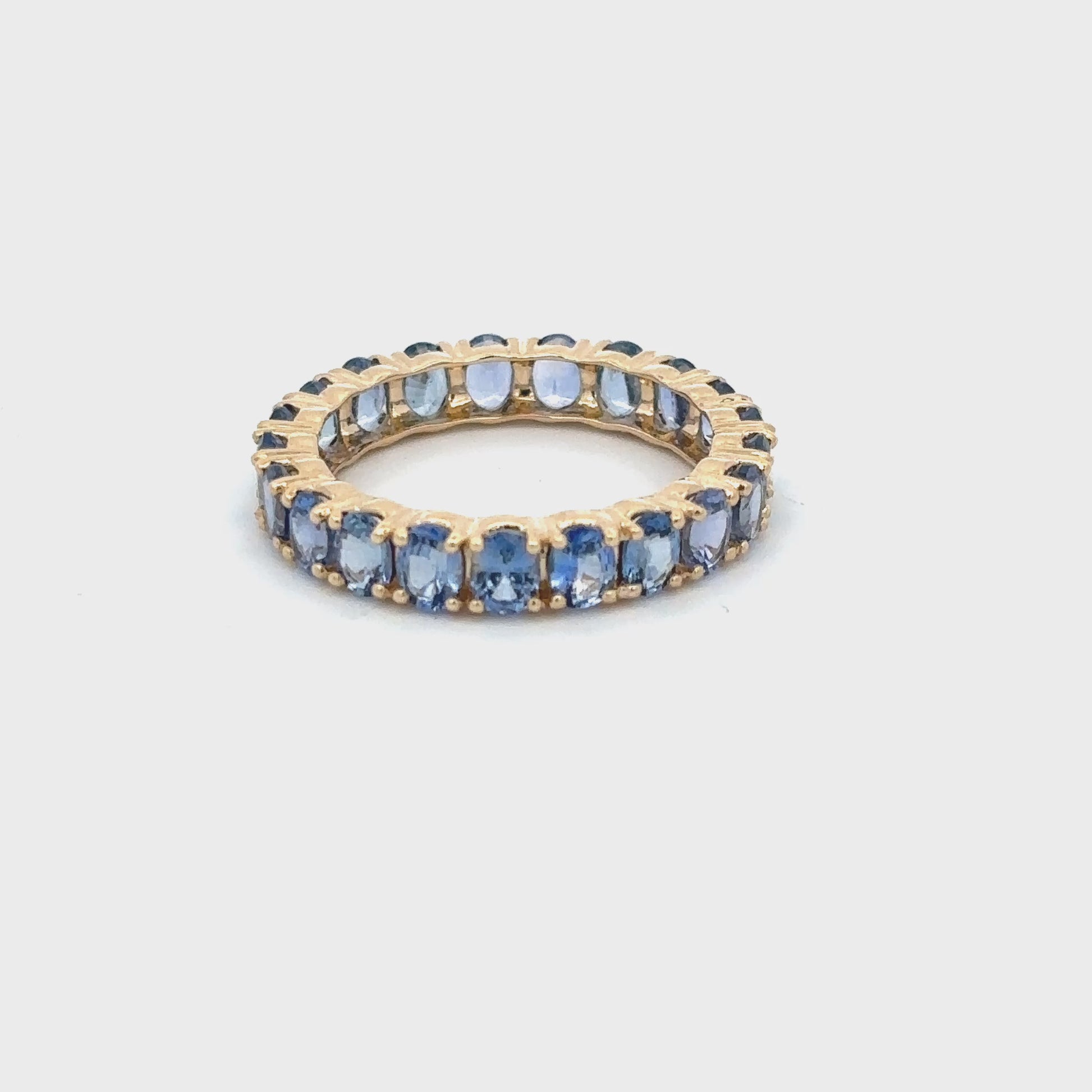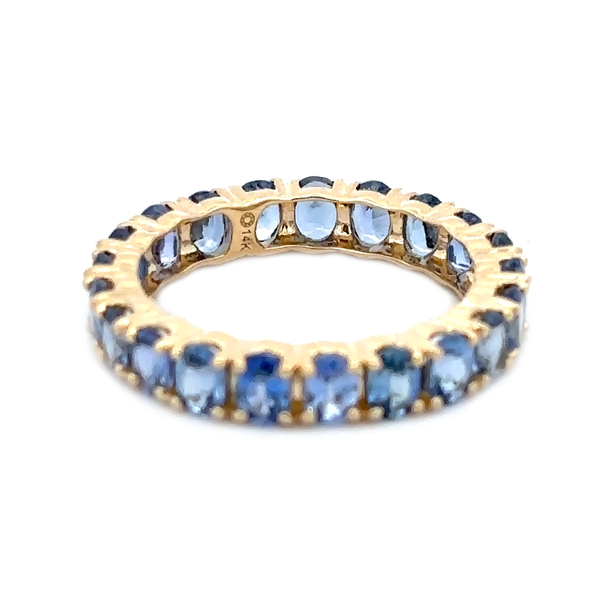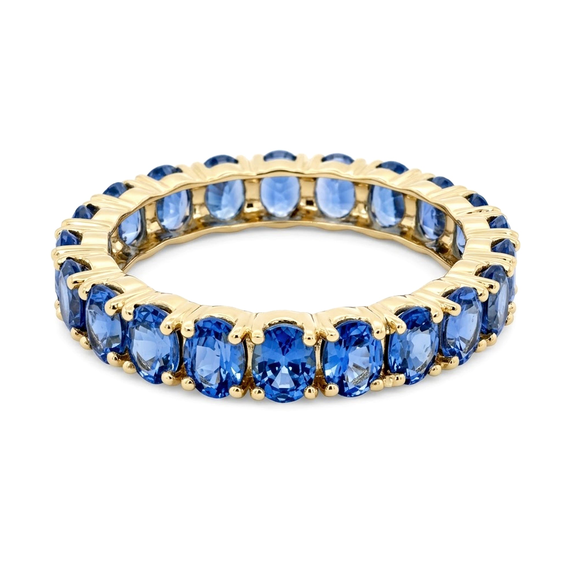 Crafted in lustrous 14K gold, this eternity band ring showcases a stunning row of Ceylon blue sapphires, each precisely cut to 4x3mm dimensions. The rich, velvety blue hue of Ceylon sapphires is renowned for its depth and brilliance, making this piece a timeless symbol of elegance and sophistication. The continuous band design creates an unbroken circle of gemstone beauty, perfect for marking life's most meaningful moments or elevating your everyday jewelry collection. A versatile addition that pairs beautifully with engagement rings or stands alone as a statement piece.