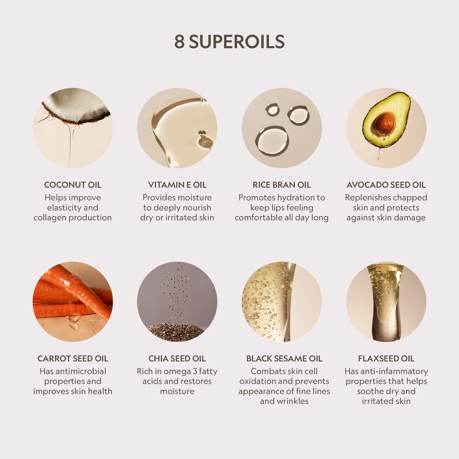 - 8 SuperOils Blend: A powerful fusion of nourishing oils that deeply hydrate and condition your lips