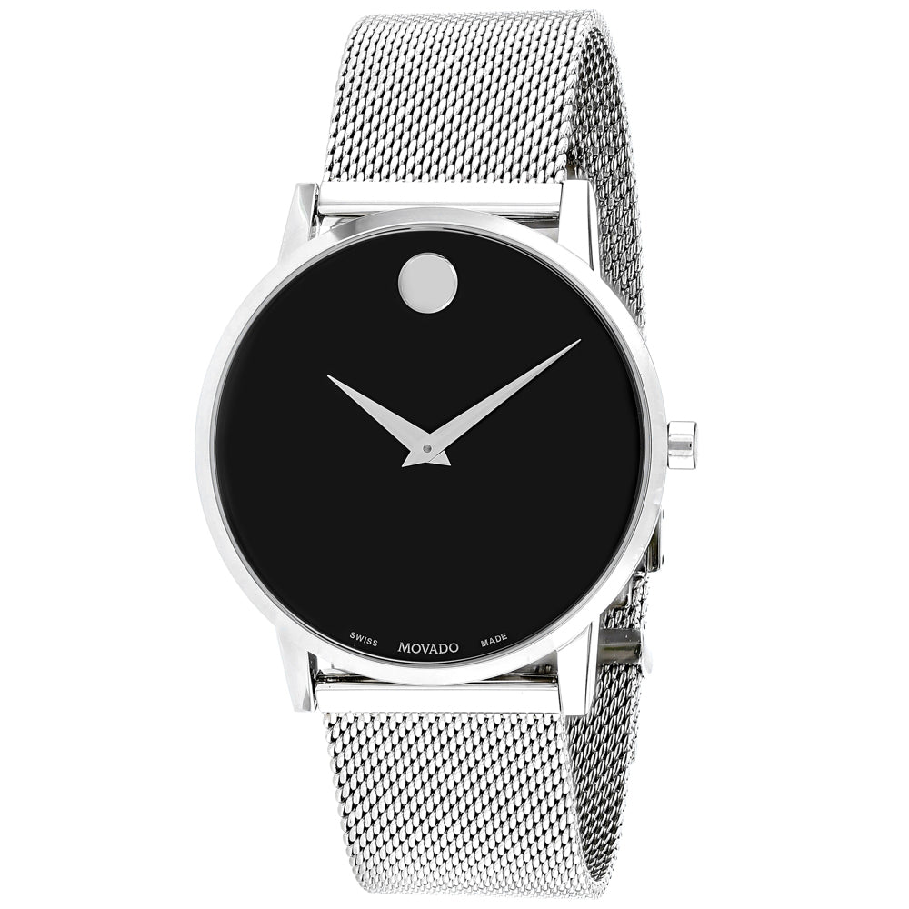 Timeless elegance meets Swiss precision with this Movado Men's Museum watch. The iconic 40mm case features the brand's signature minimalist dial design, instantly recognizable and endlessly sophisticated. Powered by reliable quartz movement and crafted in Switzerland, this timepiece delivers accuracy you can depend on. The sleek mesh bracelet combines comfort with contemporary style, adjusting seamlessly to your wrist. Water-resistant construction makes it suitable for daily wear, whether at the office or evening occasions. A true collector's piece that transcends trends, this watch pairs understated luxury with functional design—the perfect addition to any gentleman's collection.