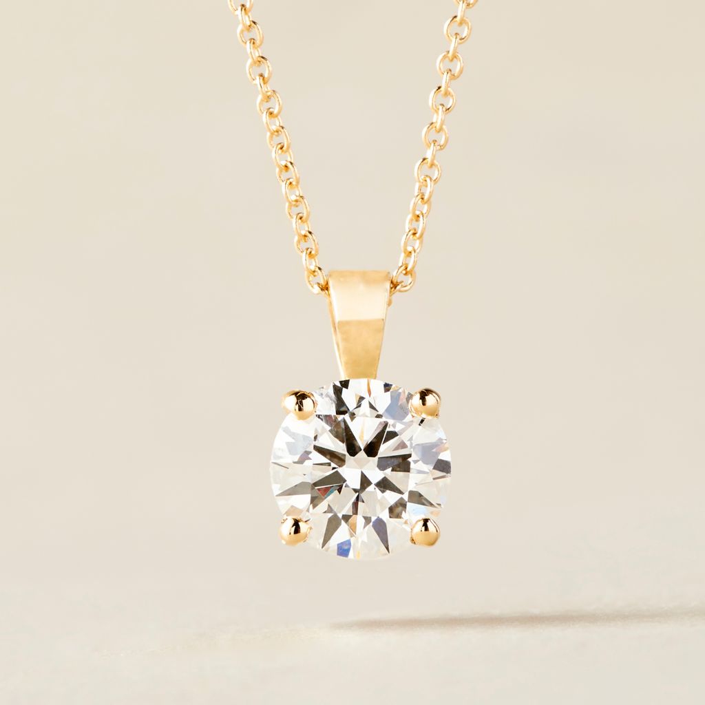 Elegant and eye-catching, this solitaire pendant is simply stunning. You'll love the dazzling sparkle on your neckline—and all of the compliments, too. Taking center stage is a glittering 1.50ctw round lab-grown diamond. The brilliant-cut gem hangs from a gleaming single bail. Expertly crafted in 14K yellow gold, it features an 18" cable link chain with a secure lobster clasp.