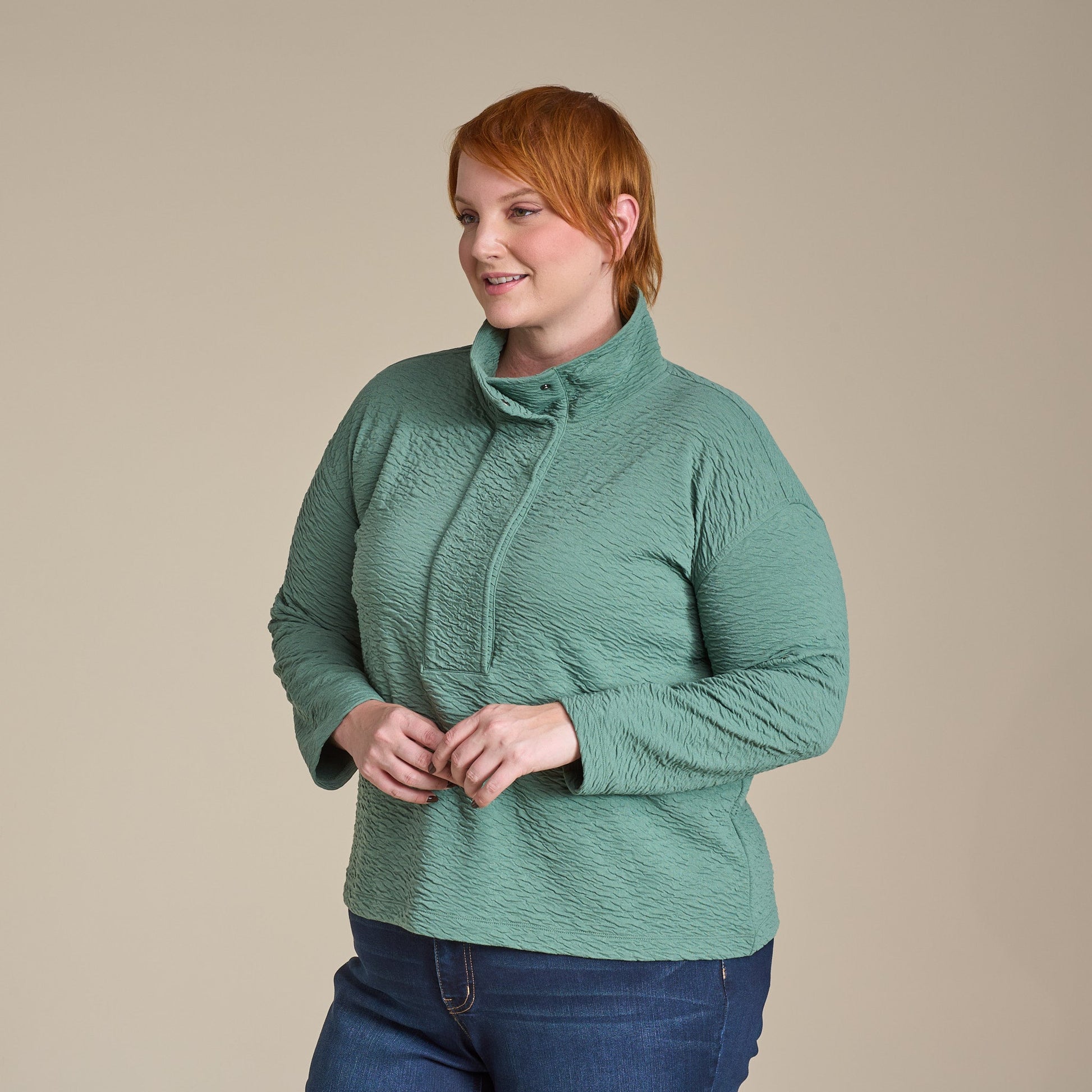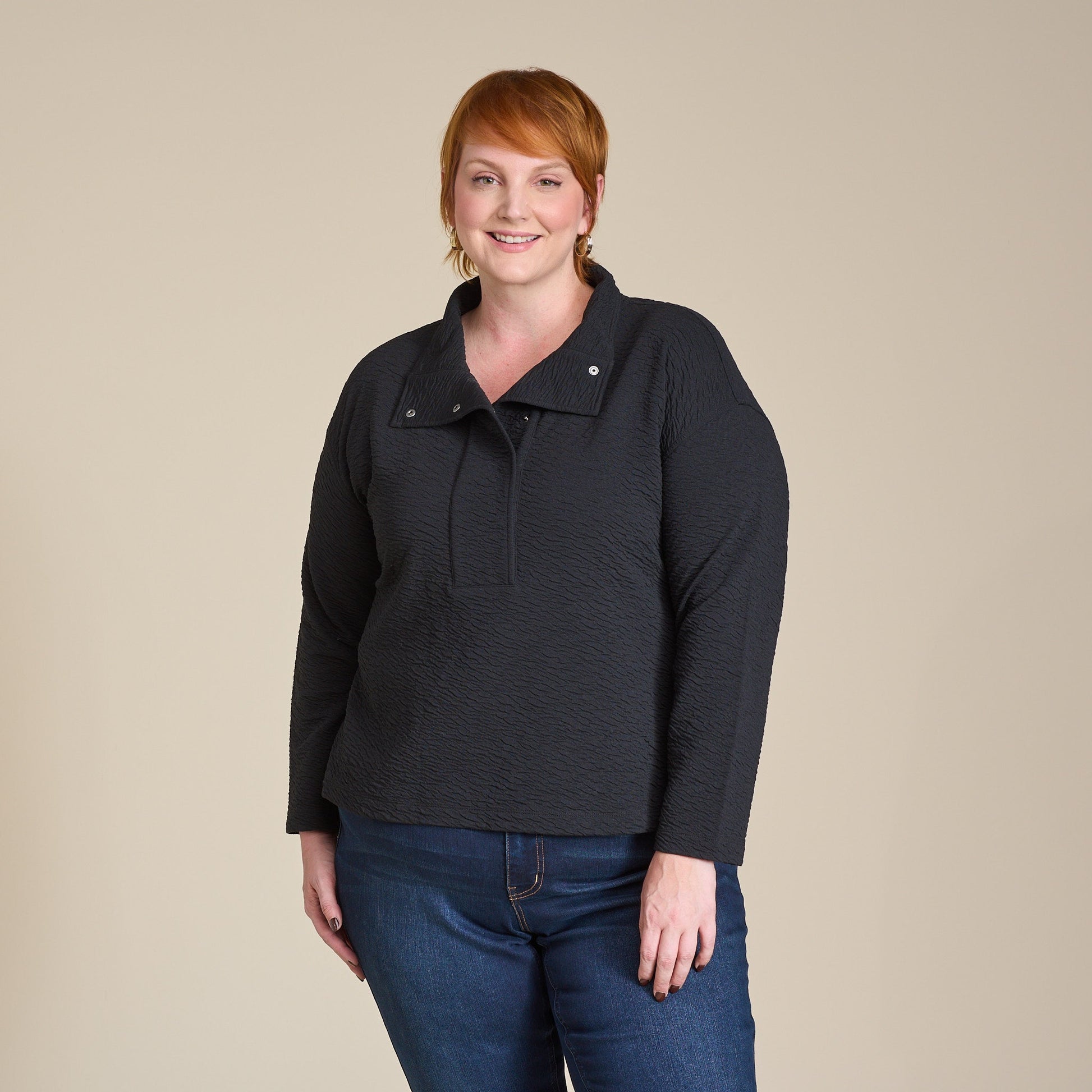 Wrap yourself in cozy sophistication with our Relaxed Restyled Jacquard Knit Pullover, crafted from ultra-soft fabric and detailed with raised jacquard texture for a refined touch. Hidden snaps at the neckline let you wear it your way—buttoned up for warmth or open for effortless ease.