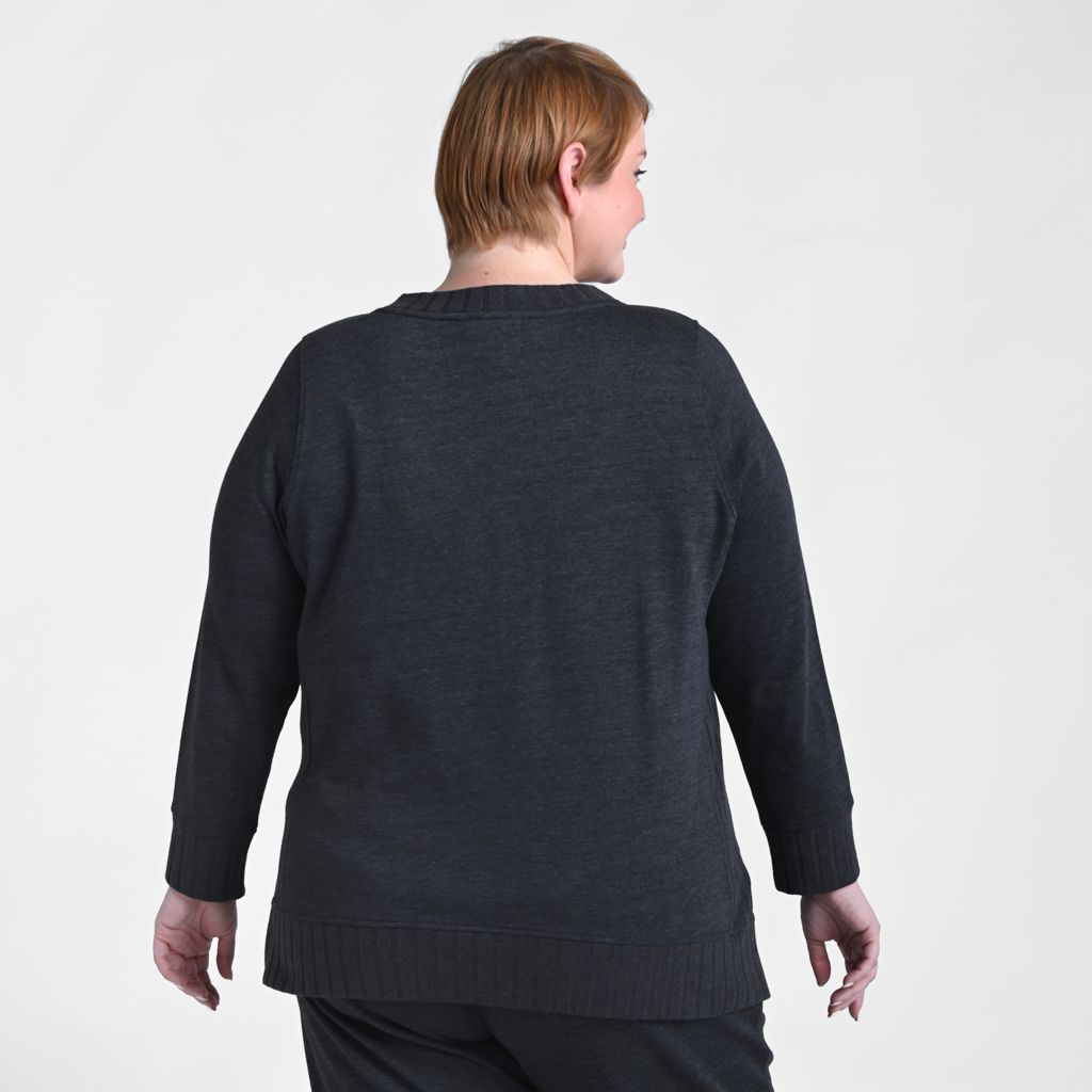 Elevate your everyday look with our stylish top, designed with ribbed side panels, cuffs, and trim for added texture and style. Available in two versatile colors, it pairs perfectly with the coordinating rib trim pants for a chic, effortlessly comfortable outfit.