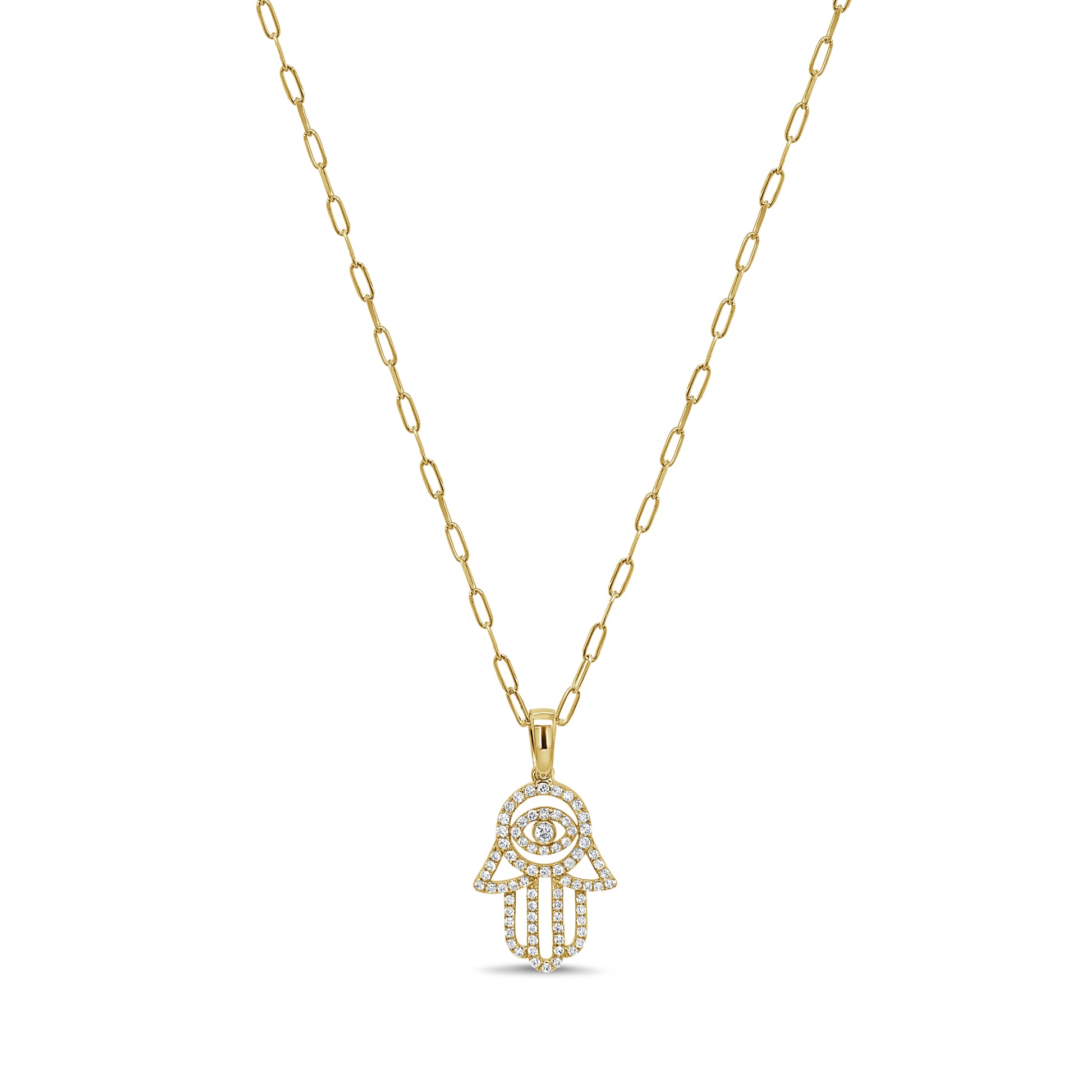 Elevate your jewelry collection with this exquisite 14K gold hamsa pendant, expertly crafted by Sabrina Designs. Featuring 0.33 carats of sparkling diamonds set within the iconic protective symbol, this piece combines timeless spiritual significance with refined luxury. The pendant arrives complete with a coordinating chain, ready to wear. Perfect for those seeking meaningful jewelry that balances elegance with personal symbolism, this hamsa pendant makes a sophisticated statement whether worn daily or reserved for special occasions.