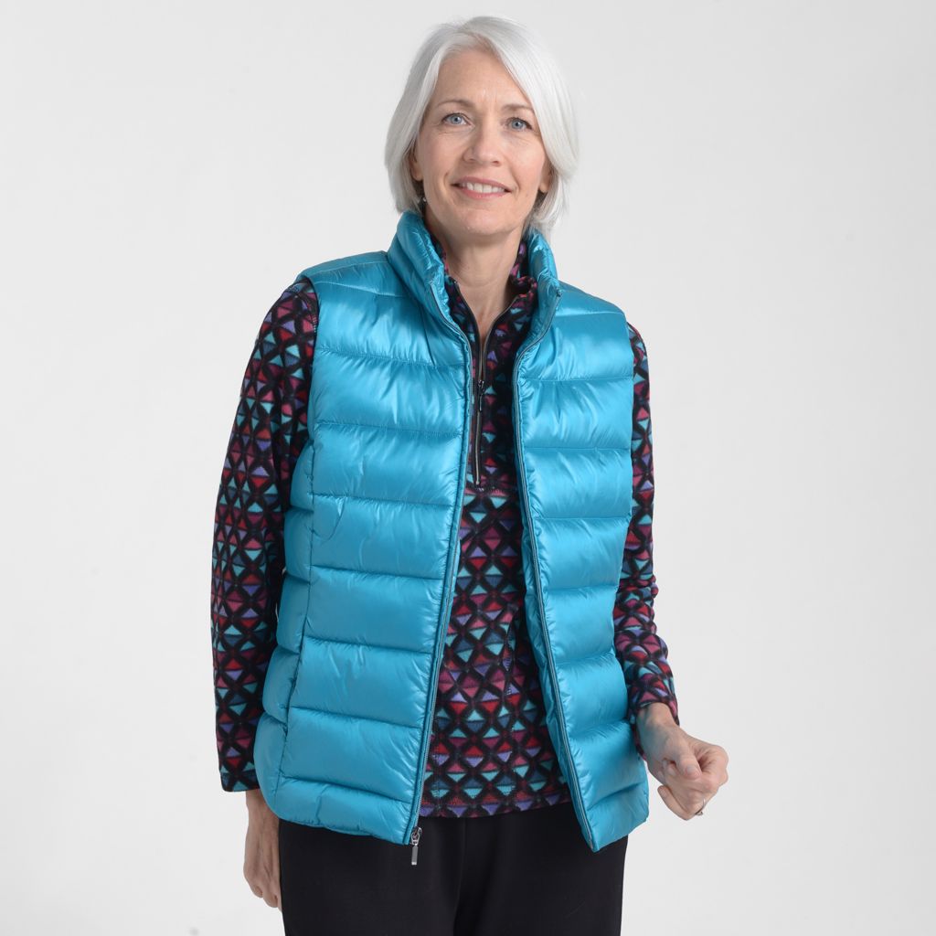 Our Shine Zip Front Vest combines horizontal channeled quilting and a flattering curved hem for a sleek, feminine silhouette that's both stylish and functional. With its mock neck collar for added warmth and three vibrant color options, it's the perfect layering piece to brighten up your look.