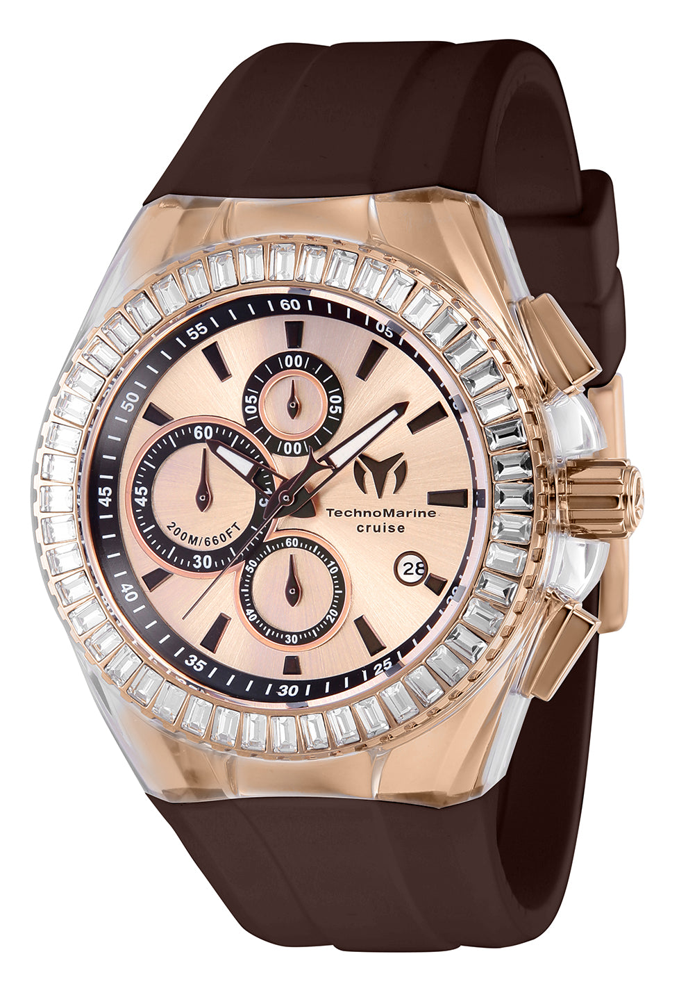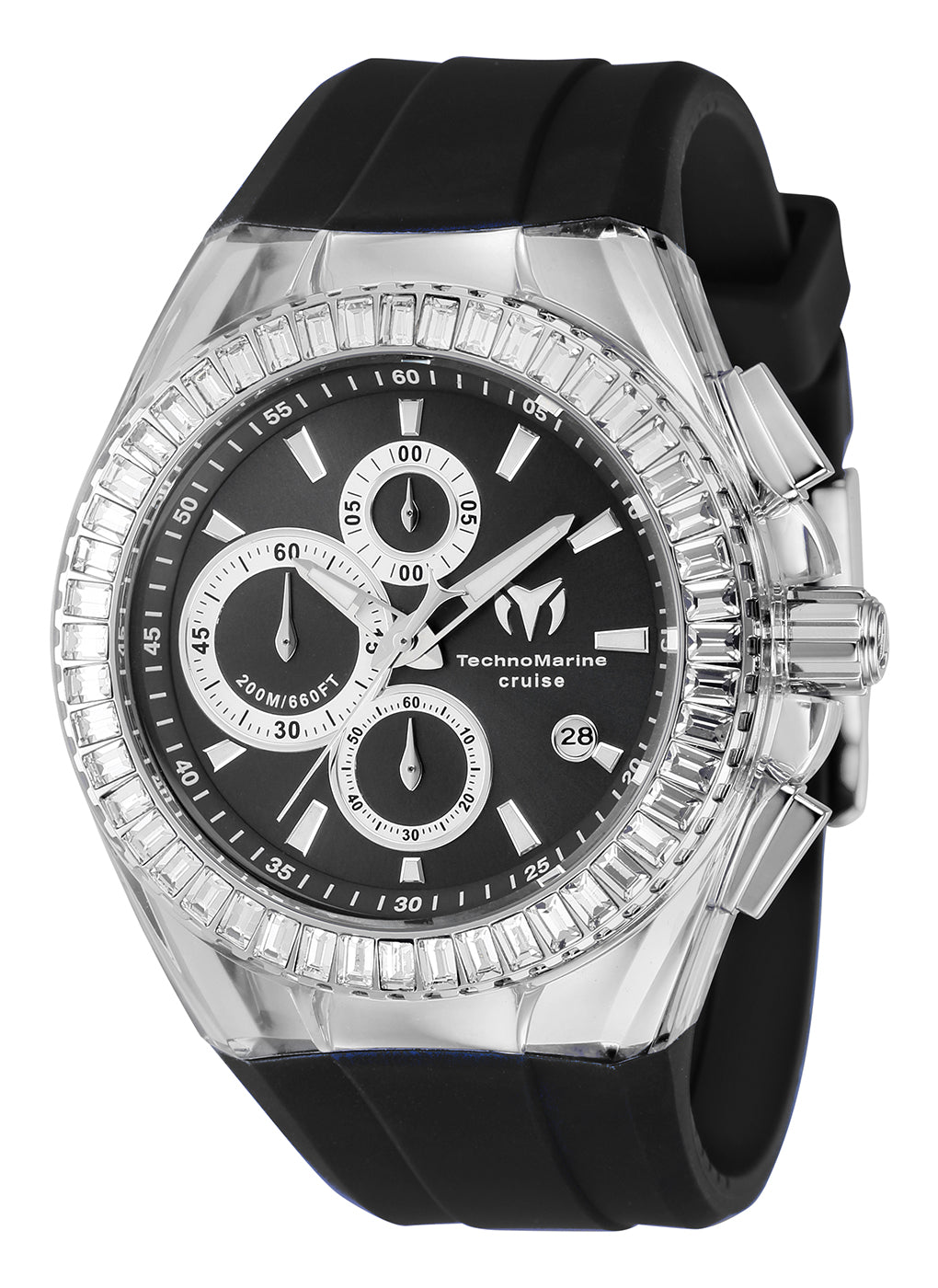 The TechnoMarine Cruise delivers bold timekeeping with a commanding 45mm case and precision quartz movement. Its baguette crystal design adds sophisticated geometric appeal, while the durable silicone strap ensures comfort and resilience for everyday wear. Built for the modern man who values both style and reliability, this watch combines striking aesthetics with dependable performance. An ideal choice for those seeking a statement piece that transitions seamlessly from casual to professional settings.