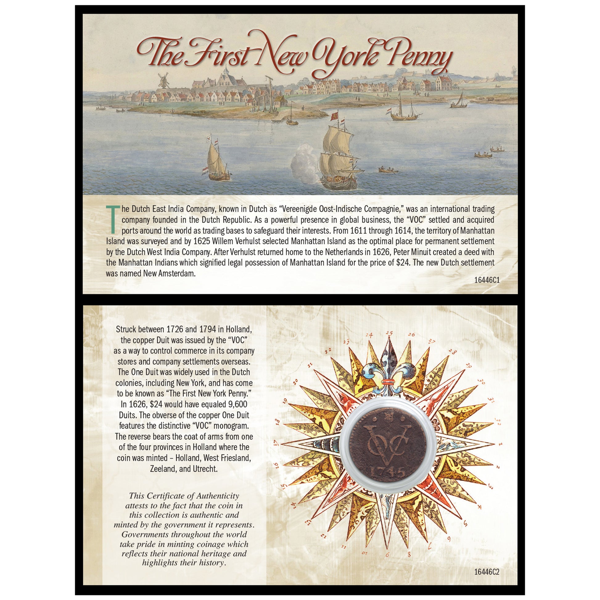 Struck between 1726 and 1794 in Holland, the copper Duit was known as the First New York Penny. The coin was issued by the Dutch East India Company otherwise known as the VOC and brought to New Amsterdam, later known as New York by their trade company, the Dutch West India Company. This exciting coin is guaranteed to be over 225 years old. The copper penny is displayed in a 4 by 6 inch black, vinyl wallet and has a Certificate of Authenticity.