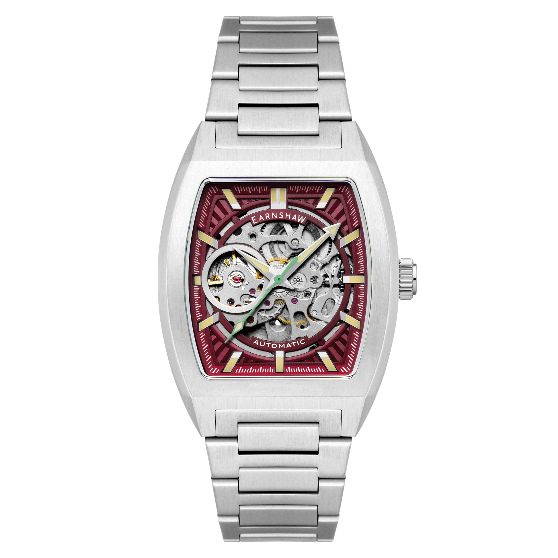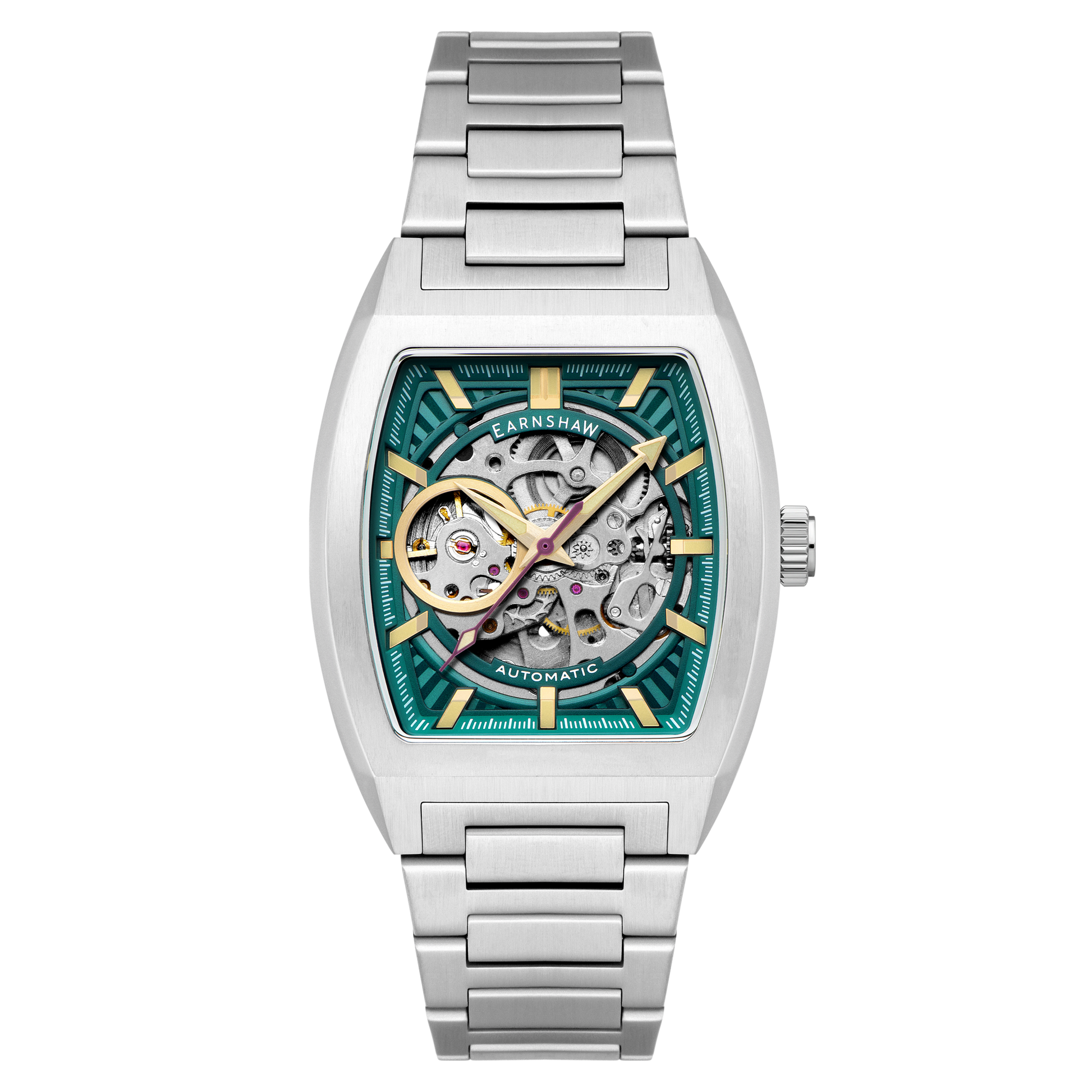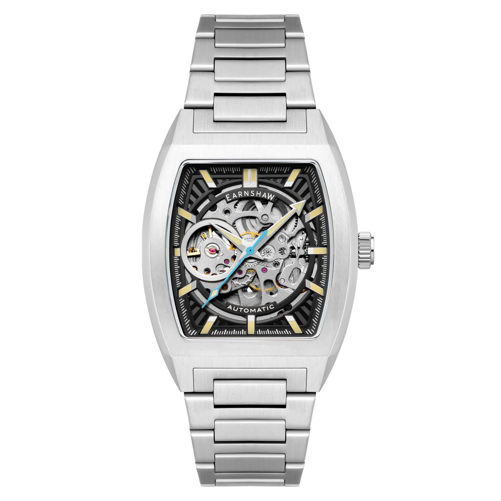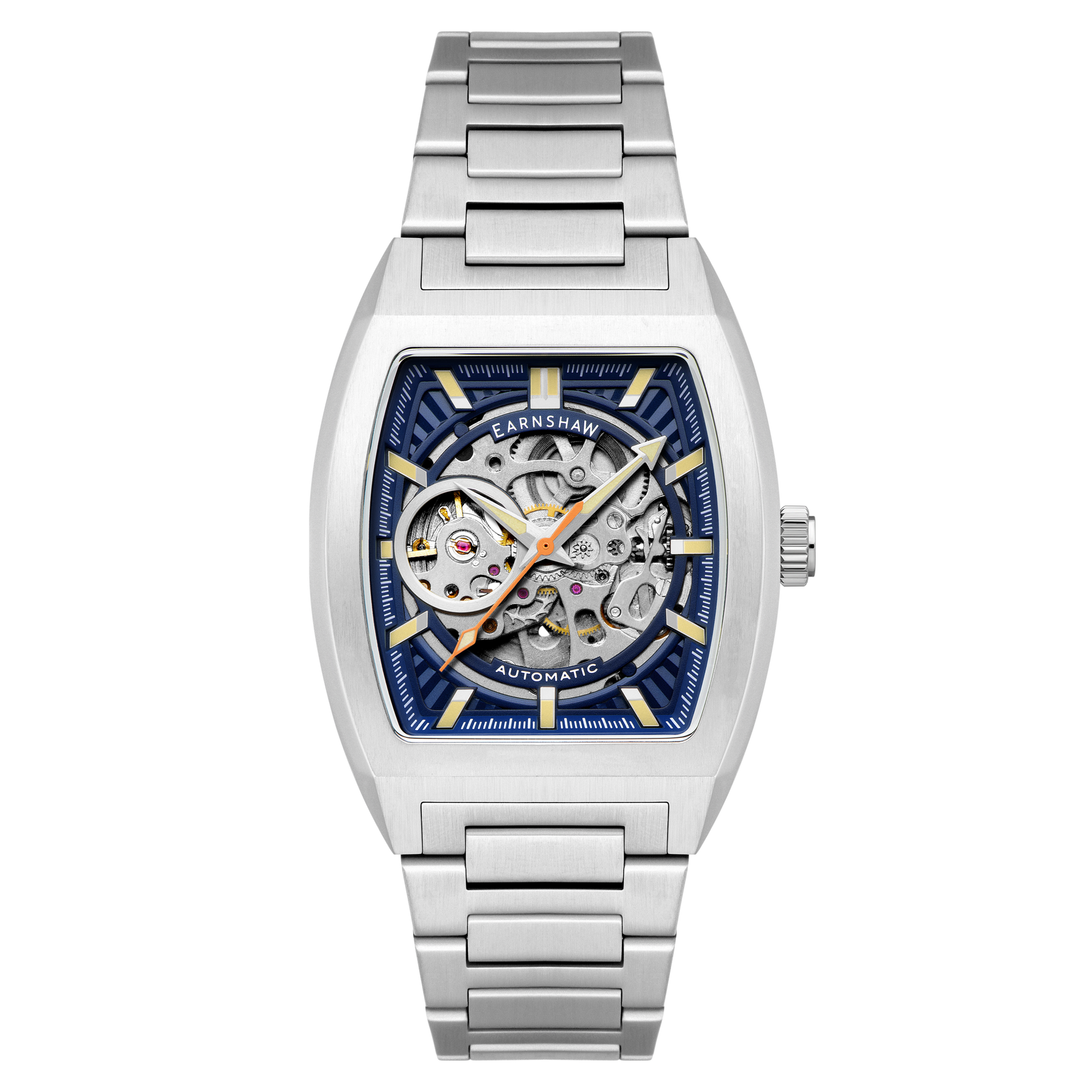 The Thomas Earnshaw Wellington combines horological sophistication with distinctive design. This 40mm automatic timepiece features a skeletonized dial that reveals the intricate mechanical movement within—a hallmark of fine watchmaking. The tonneau case shape offers ergonomic comfort and visual distinction, while the integrated bracelet ensures seamless wrist presence. Powered by an automatic movement, this watch delivers reliable timekeeping with the engaging appeal of visible mechanics. An ideal choice for collectors who appreciate engineering excellence and refined aesthetics.