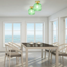 The 10.25" H William Green Globe Ceiling Light from River of Goods gives you a fun, retro-style lighting option for any space in your home. This ceiling light showcases a green glass globe shade and a brushed gold-finish metal base for eye-catching contrast. It requires one 40-watt E26 bulb (not included), and it's also LED compatible. Easy to pair with a variety of retro or contemporary decor schemes, it's sure to cast a soft, warm glow in whatever room you install it in.