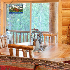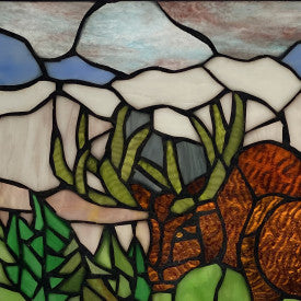 Create a stunning array of colors in any space in your home with this 12" H Moose in Mountainscape Stained Glass Window Panel. The decorative panel is made from 173 cuts of stained glass in brown, gray, blue and green shades that become even more beautiful in the sunlight. The design showcases a majestic antlered moose near a stream in a stunning mountainscape and will complement your cabin, lodge, traditional or nature-themed decor with a touch of whimsy. Plus, the included attachable 22-inch decorative metal chain makes it easy to hang in any sunny window.