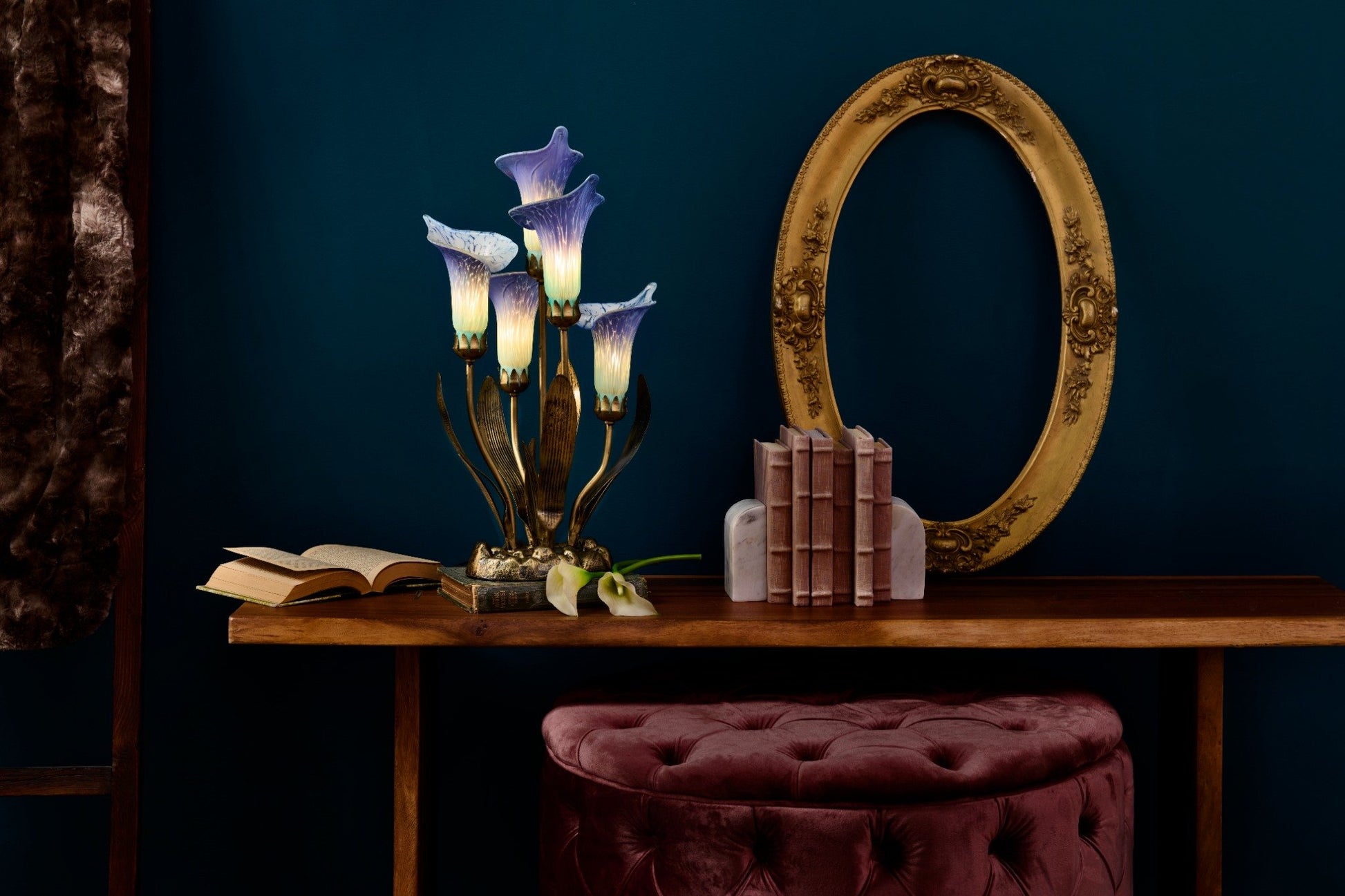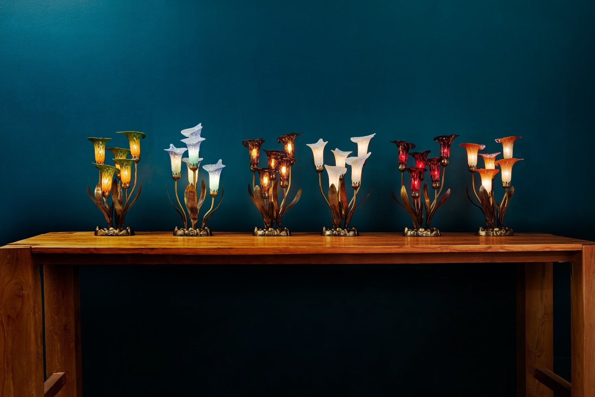 - Five glass calla lily shades cast a warm glow