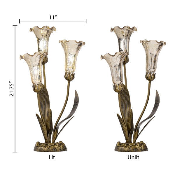 This novelty table lamp with unique floral shades marries vintage and traditional styles, creating a beautiful and unique lighting option for your bedroom, living room or entryway. Showcasing an antique brass novelty metal base and designed like flower stems leading up to three lily shaped glass bell shades, this table lamp casts a soft glow with three 15-watt Type B bulbs (not included). A great pairing with Bohemian, transitional or eclectic decor, it also features a 64-inch cord with an in-line switch for versatile placement.