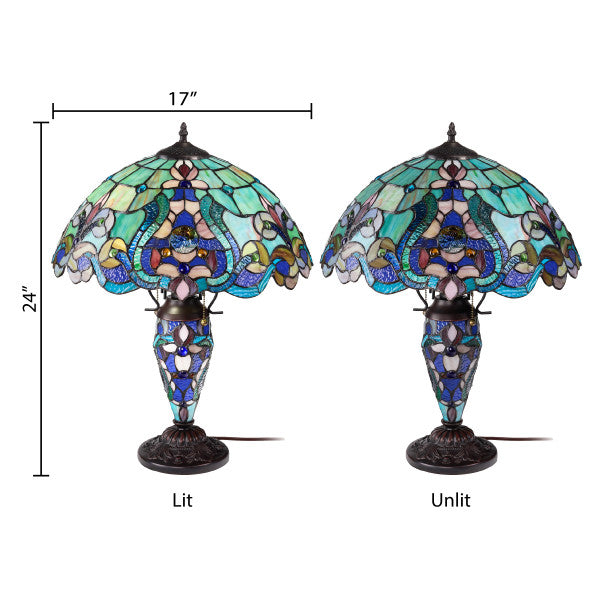 Enhance your living space with the 24" H Margaret Teal Bowl Shade Urn Table Lamp from River of Goods. This traditionally-inspired lamp features an exquisite Tiffany-style stained glass shade with a mesmerizing blend of teal, blue, purple, green, and amber hues. Hand crafted from 467 pieces of glass, 50 cabochons, and complemented with three stunning rosettes, the lamp achieves a true work of art. The urn-shaped base in antique bronze finish further adds to its classic appeal. Equipped with two pull chains, it brings both style and functionality to your decor, making it a perfect addition to any traditional setting.