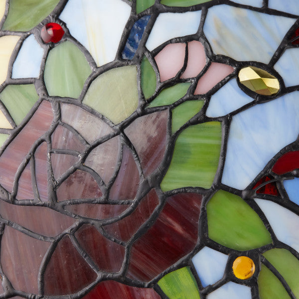 This exquisite table lamp, with its intricate design and vibrant colors, adds a touch of charm and elegance to any room. Crafted with a novelty base shaped like a tree features branches and leaves. The dome-shaped shade depicts multicolored roses and colorful birds, all made from 522 beautifully cut, multi-colored stained glass pieces. The downlight illumination provides a cozy and soothing ambience, perfect for a quiet reading session or a relaxing evening. This lamp, with its gorgeous antique finish, embodies the essence of the cottage style, making it a lovely addition to your home decor.