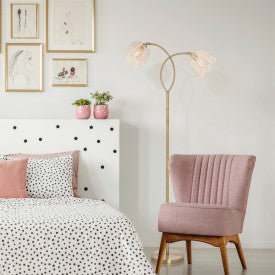 The 61" H Meg Brushed Gold-Color Metal Candlestick Floor Lamp with Rattan Shades contributes the timeless, classic look of a cottage to your abode. This brushed-gold color candlestick floor lamp stands 61 inches tall and extends two arms to hold two white, bell-shaped rattan shades, adding a casual, relaxed vibe to a range of interior decor styles. The rattan shades’ open-weave design will create a glow when each of two 40-watt bulbs (not included) shine through. Use this light in your bedroom, your craft area, or in a kitchen or breakfast nook for the cozy, shabby-chic look you love.