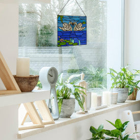 Brighten up any space in your home with this Swans Stained Glass Window Panel. The decorative panel boasts 122 pieces of stained glass in blue, white, green and pink, along with two cabochons that will become even more resplendent in the sunlight. The design showcases two swans on a lake with lotus flowers, beautifully complementing your bohemian, eclectic or cottage decor. The included attachable 24-inch decorative metal chain allows for immediate hanging in a sunny window, where it will fill your space with colorful light.