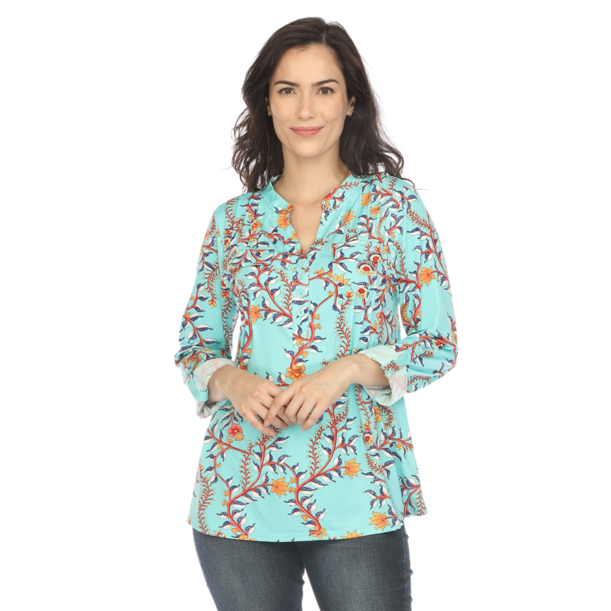 Elevate your wardrobe with the White Mark Women's Paisley Top. This button front top features beautiful paisley print and roll tab sleeves for a versatile and chic look. Perfect for any occasion, this top will add a touch of elegance to your style.