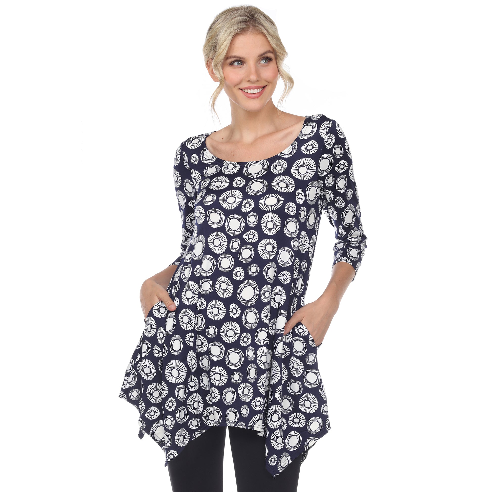Add some geometric flair to your wardrobe with White Mark's printed tunic top! Featuring a playful circle pattern, this tunic is both stylish and comfortable. Perfect for a casual day out or a fun night in. Update your look with this quirky top today!